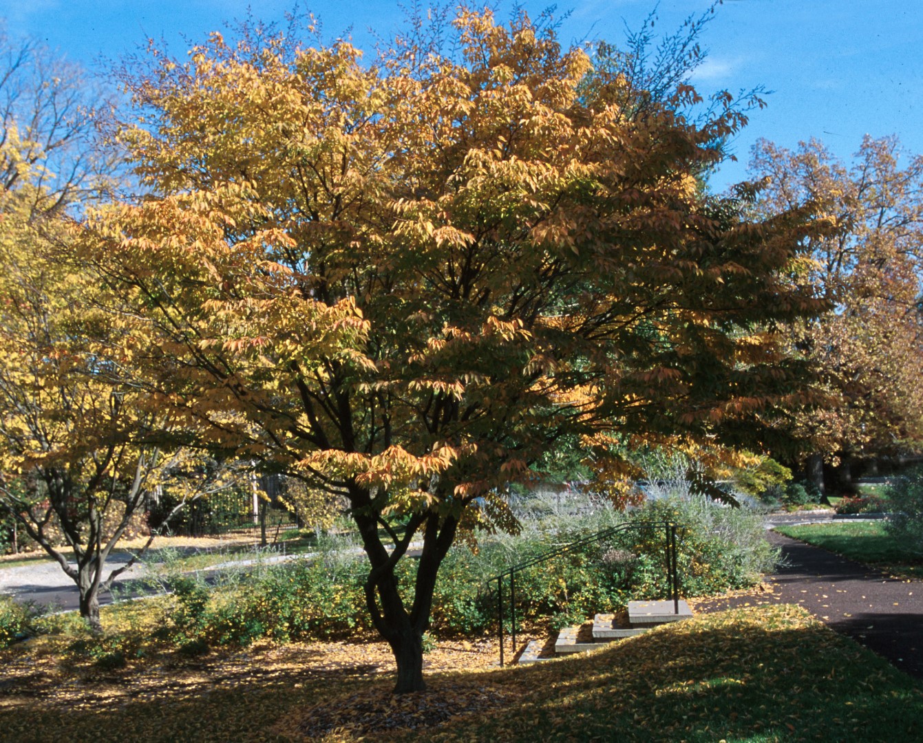 Ett litet träd i odling, men som växer till ett medelstort eller till och med stort träd under gynnsamma förhållanden. Den breda kronan är rund till tillplattat sfärisk, vilket beror på de graciöst överhängande kvistarna. Unga kvistar är håriga, äldre kvistar släta och grå. Redan vid cirka sju års ålder syns grunda ljusgråa spår i barken. Bladen är bronsfärgade till rödaktiga när de vecklas ut och blir matt mörkgröna på sommaren. Ger få höstfärger. Rottillväxten är ganska ytlig. Har få krav på jordmånen men trivs bäst i lerjordar. De nedbrutna bladen är ett bra jordförbättringsmedel.