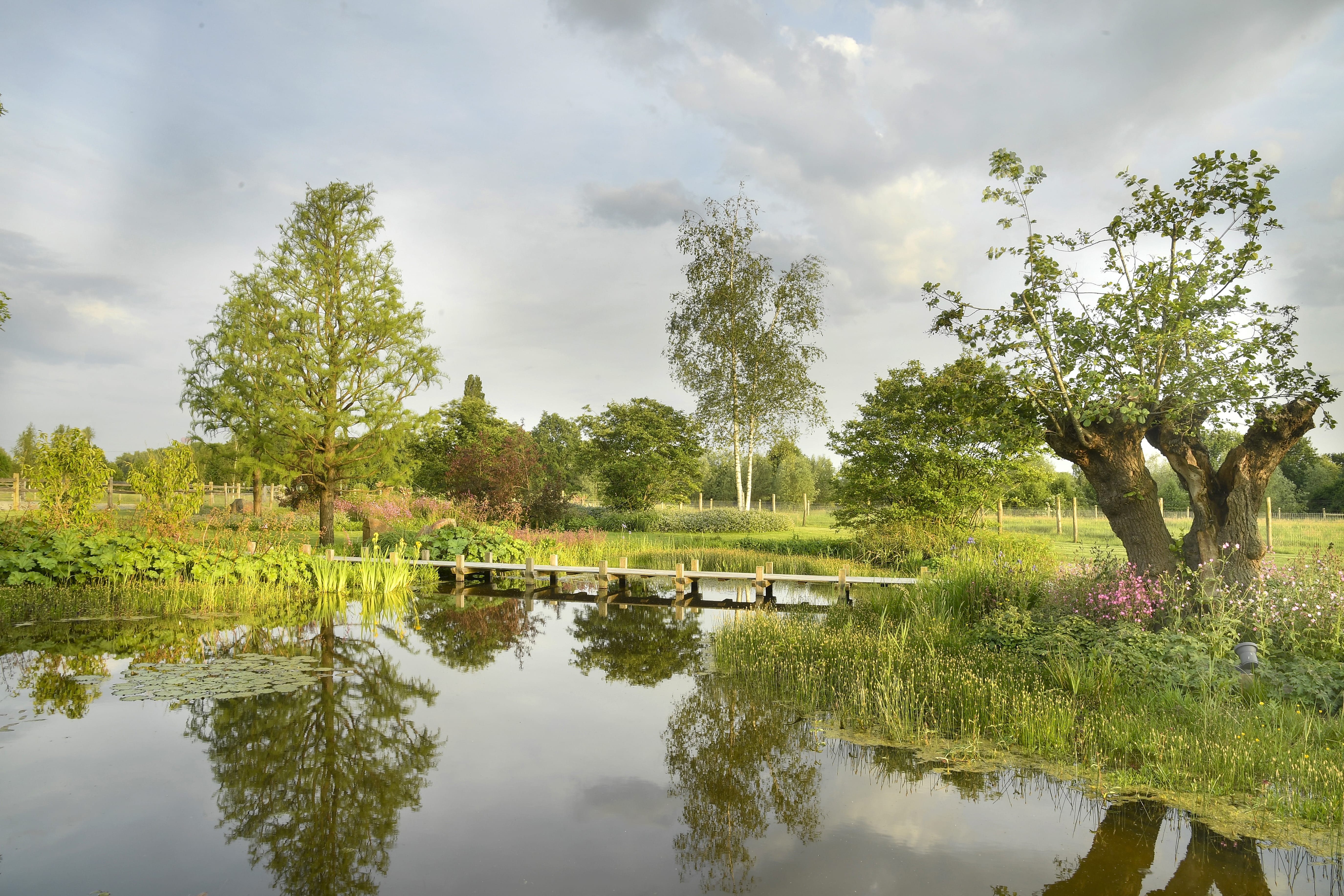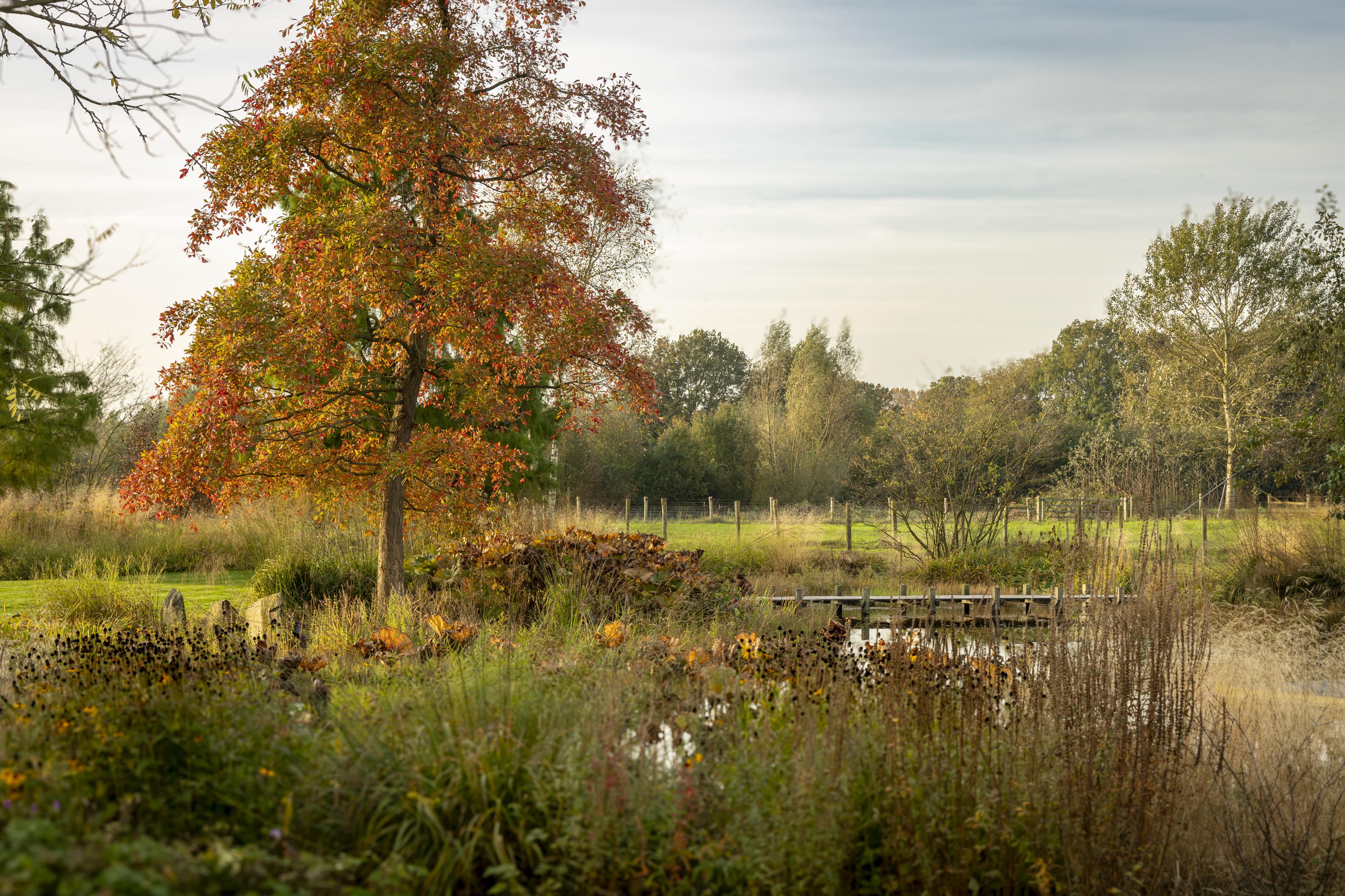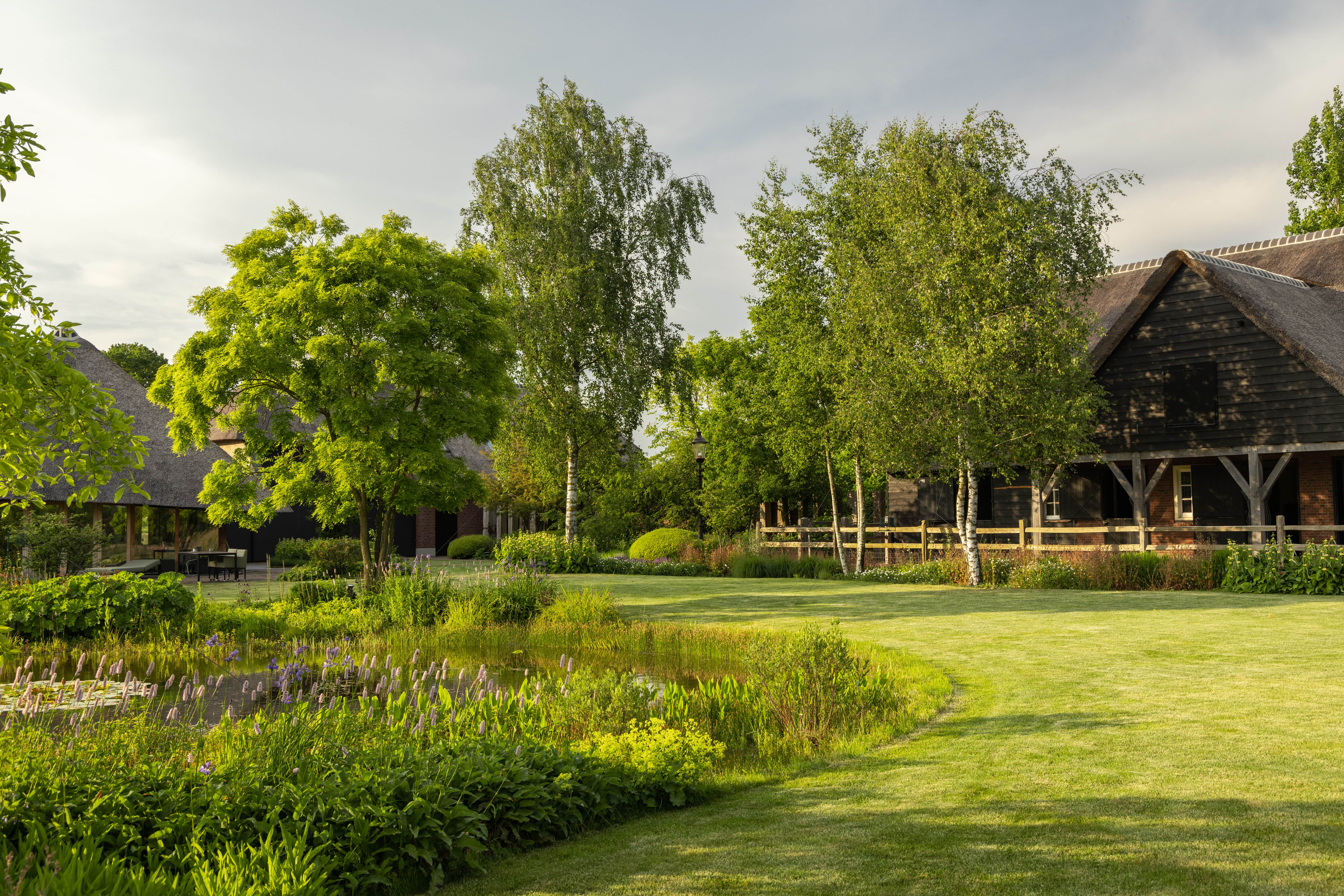 Genom att arbeta med mogna, karaktärsfulla exemplar får landskapet omedelbart lugnet och naturligheten av en fullvuxen skog. Träden bestämmer den rumsliga karaktären, ger höjd åt det platta Brabantiska landskapet, och skapar en flytande övergång mellan de organiska formerna i trädgårdsdesignen och den skyddade naturen runtomkring.