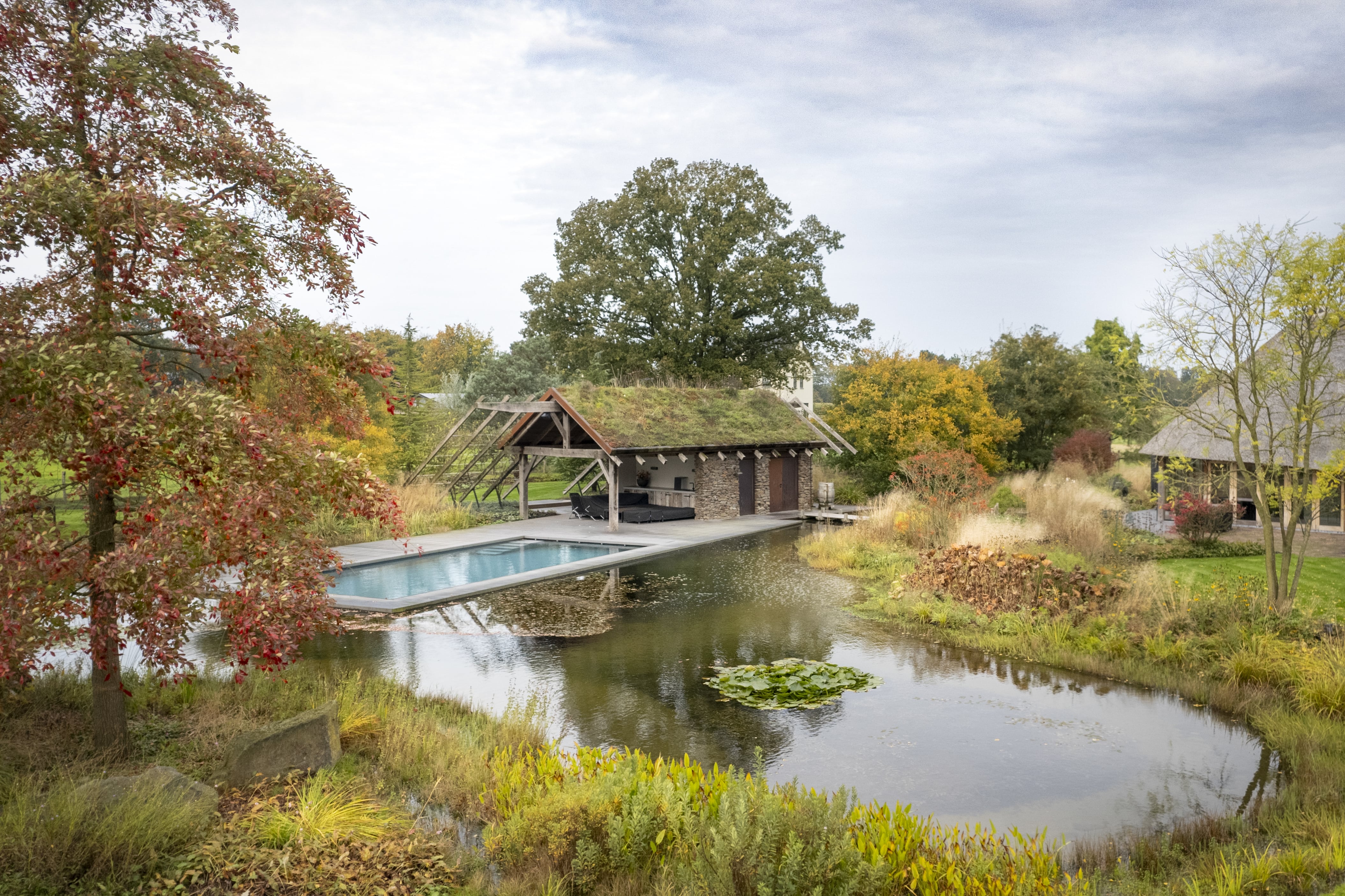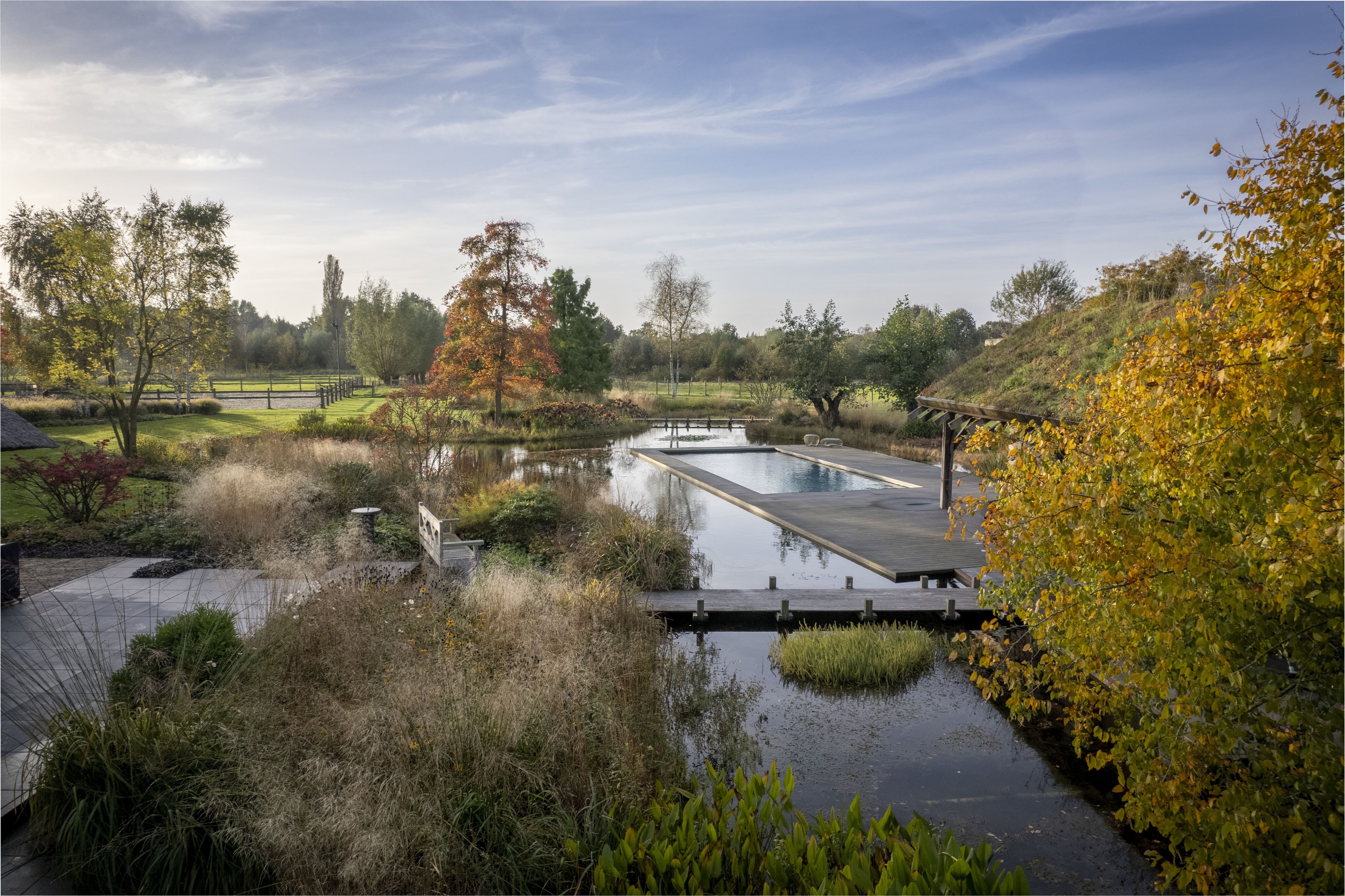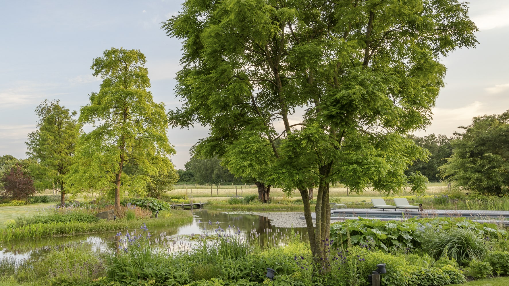 Genom att arbeta med mogna, karaktärsfulla exemplar får landskapet omedelbart lugnet och naturligheten av en fullvuxen skog. Träden bestämmer den rumsliga karaktären, ger höjd åt det platta Brabantiska landskapet, och skapar en flytande övergång mellan de organiska formerna i trädgårdsdesignen och den skyddade naturen runtomkring.