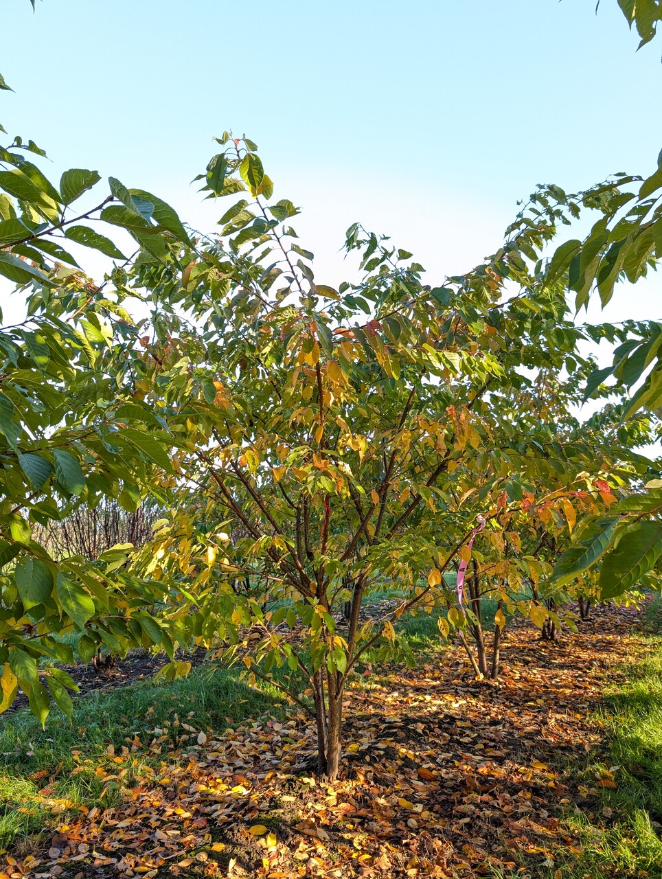 The leaves of Prunus serrulata 'Kanzan' turn gul, orange in autumn.