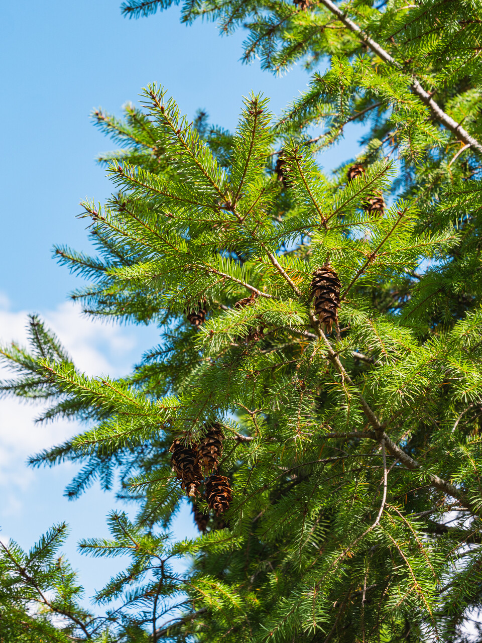 hanging cones, long ovoid, reddish brown, 8 - 10 cm