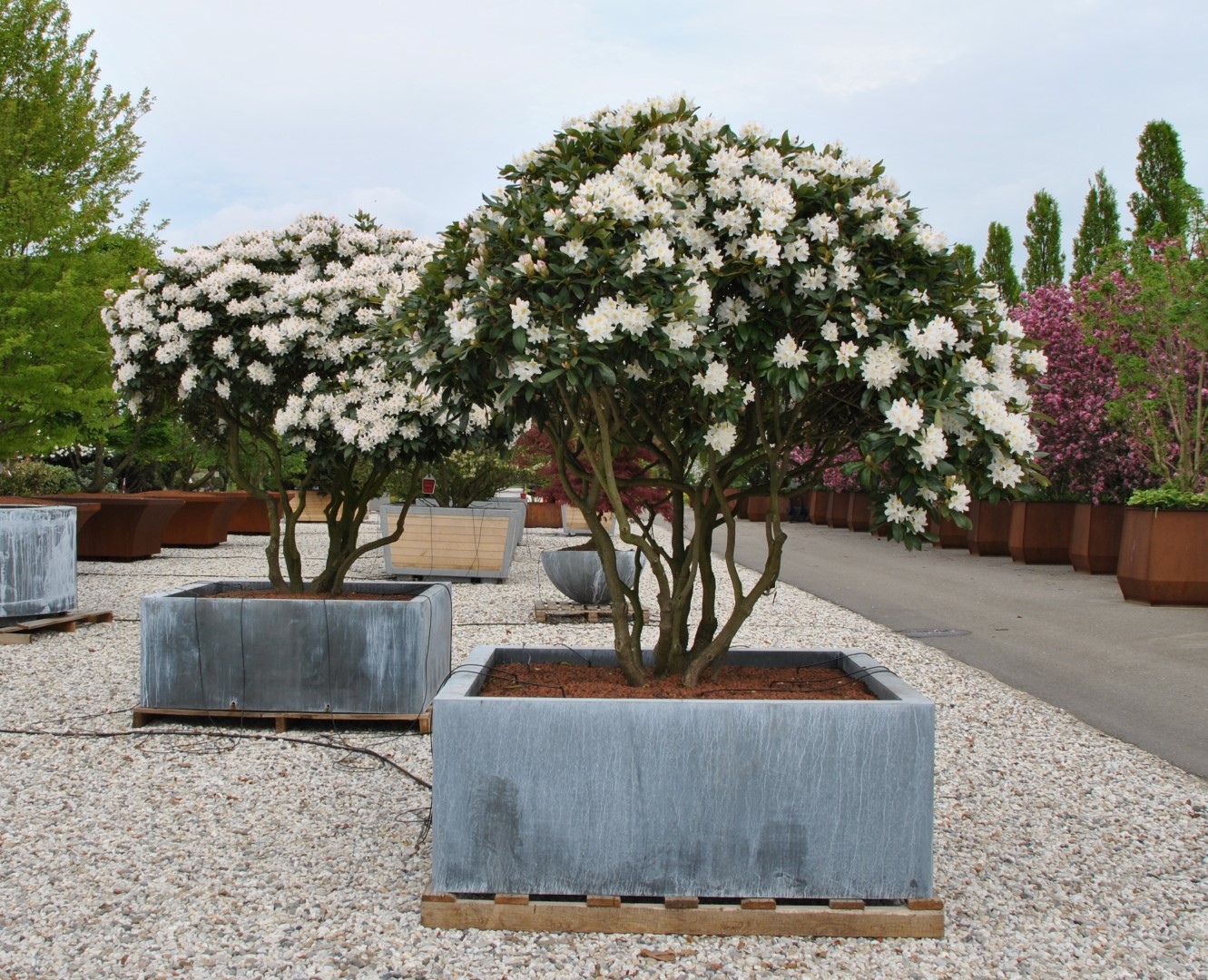 A classic, early-flowering rhododendron with a wide upright habit and good branching. Richly flowering with white flowers with a yellow macula. Also suitable for use as a wide hedgerow.