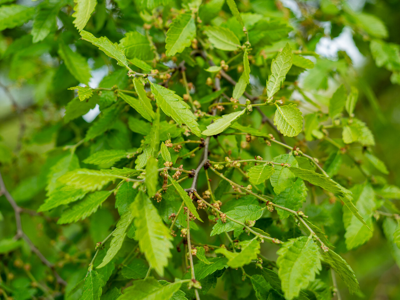 Zelkova carpinifolia 'Verschaffeltii' blooms in april.